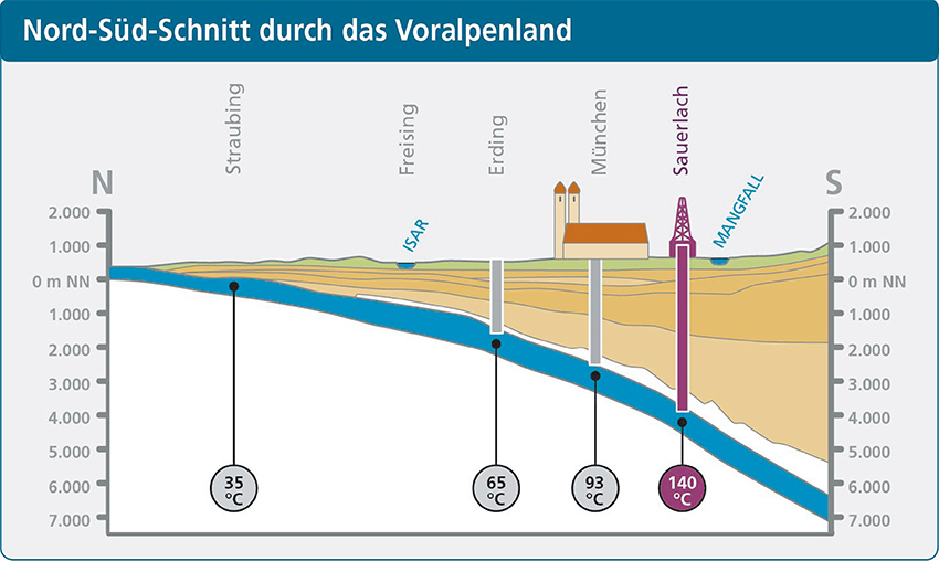 As shown in the sectional view above, beneath Munich the water-bearing formation is diverted into deeper regions from the north to the south through the foot of the Alps. This means that the temperature of the water reaches up to 150°C south of Munich. The hot water can be extracted at a flow rate of up to 120 L s-1 (litres per second) but must be lifted out of depths of over 4000 m.