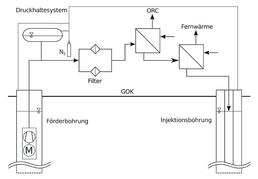During operation of the system the hot deep groundwater is pumped through the extraction bore into the surface power plant by means of a pump lowered to a depth of 1200 m (using drive M) and circulates through filtration systems (reversible flow-rotating filter, cartridge filter, bag filter), in order subsequently to output the thermal energy in a heat exchanger network to the working fluid of the electricity-generating secondary circuit and the district heating network. With a temperature difference of about 90°C to 100°C the cooled deep groundwater is re-injected into the deep-lying reservoir via an injection bore (on the right in the image).
