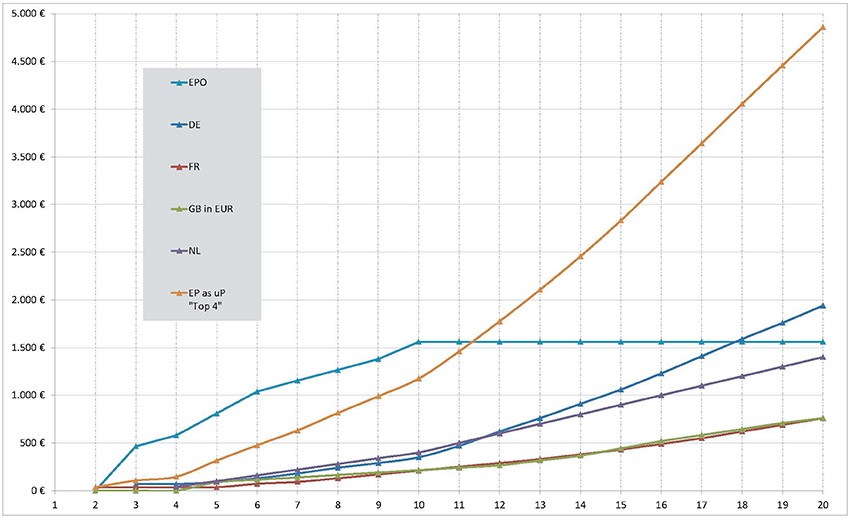 Regarding the annuity fees the EPO's "True Top 4" proposal has been permitted by the Administrative Council in the end of June 2015. This "True Top 4" proposal covers the territory of 25 EU member states and corresponds to the sum of the renewal fees currently paid for the four most frequently validated countries by the holders of European patents (Germany, France, UK and the Netherlands). The total sum for 20 years will amount to ca. EUR 35.000.